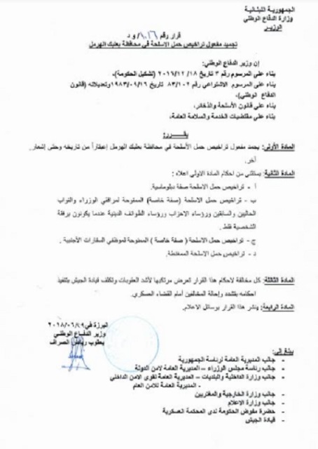 صدر عن وزارة الدفاع الوطني، قرار بتجميد مفعول تراخيص حمل السلاح في محافظة بعلبك الهرمل.