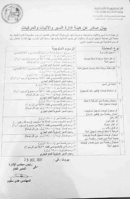 منعاً لأي التباس، وحرصا منها على معرفة المواطنين تفاصيل الرسوم المفروضة قانونا لانجاز أية معاملة في مصلحة تسجيل السيارات والآليات في جميع أقسامها وفروعها، أعلنت هيئة إدارة السير والآليات والمركبات بأن الرسوم المتوجبة هي بحسب الجدول التالي: