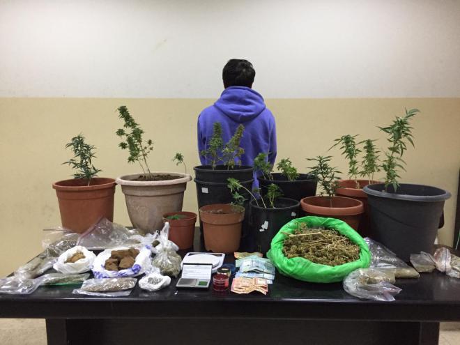 بتفتيشه، ضُبط بحوزته كمية من مادة الماريجوانا وقطعتين من حشيشة الكيف. وبتفتيش منزله ضبط في داخله ما يلي: