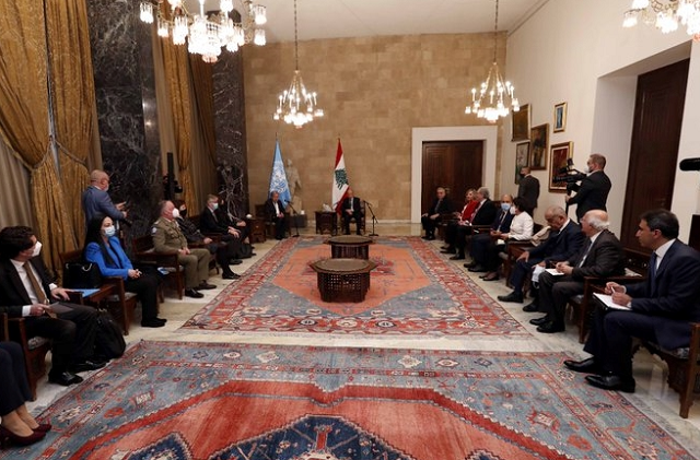 خلال الأزمات العديدة التي عصفت بلبنان منذ 1948 واللجوء الفلسطيني وحتى يومنا هذا.. فإن منظمة الأمم المتحدة كانت عامل دعم ومؤازرة للاستقرار خصوصاً عبر قوات “اليونيفيل” في الجنوب، وشريكاً في التنمية عبر أجهزتها العاملة في لبنان. لقد بحثت مع سعادة الأمين العام في الأزمات المتلاحقة التي يعاني منها لبنان والسبل الايلة الى الخروج منها لا سيما ما يتعلق منها بالأوضاع الاقتصادية والمعيشية التي تردت خلال الأشهر الأخيرة. أكدتُ للأمين العام ان لبنان سيشهد في الربيع المقبل انتخابات نيابية ستوفر لها كل الأسباب كي تكون شفافة ونزيهة تعكس الإرادة الحقيقية للبنانيين في اختيار ممثليهم، ونرحب بأي دور يمكن ان تلعبه الأمم المتحدة في متابعة هذه الانتخابات بالتنسيق مع السلطات اللبنانية المختصة”.